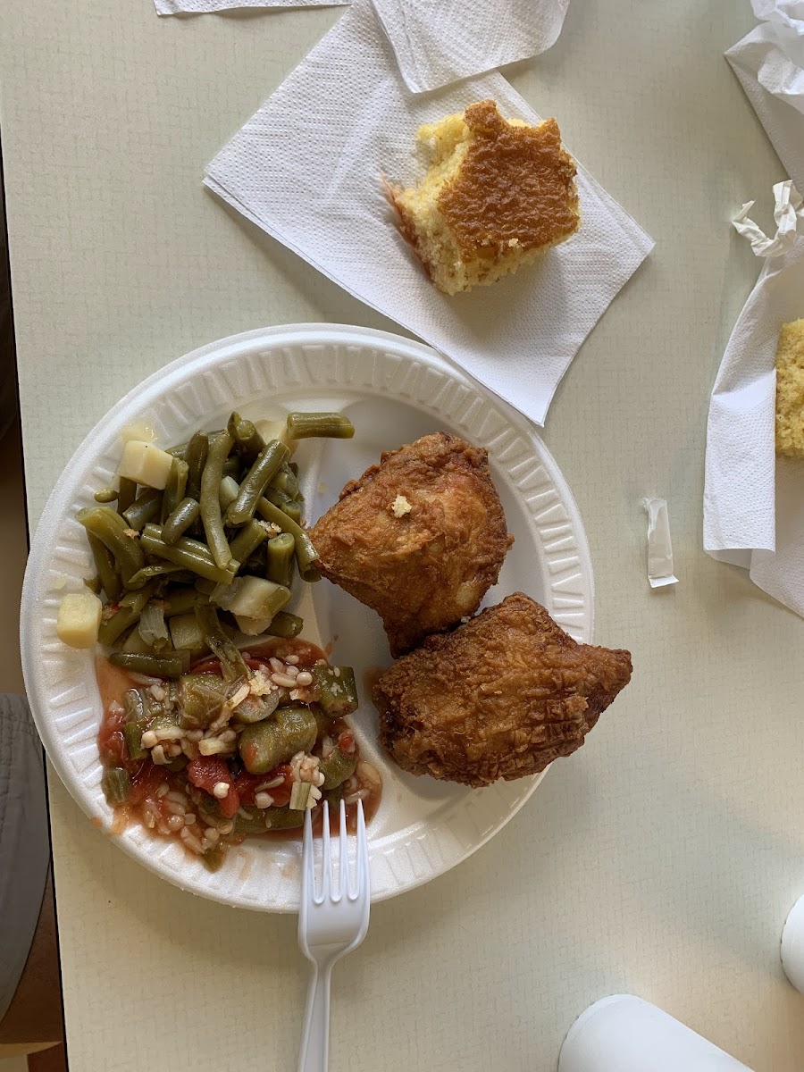 Oh my God! This food is awesome. Best fried chicken. Had green beans, okra-tomato stew, cornbread and peach cobbler. Great customer service. Nice and clean seating area. Many locals here and all love the food. Highly recommend.